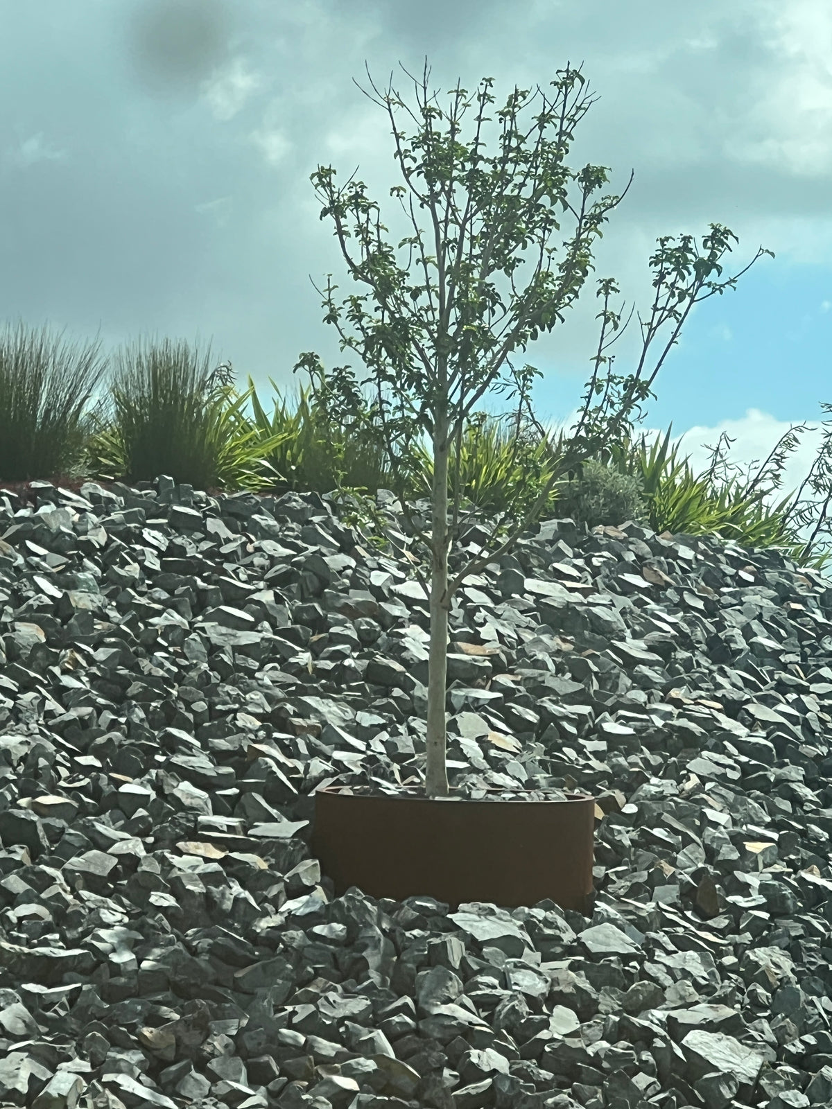 The sloping contours of the Mānawa Bay site called for a planting solution that could respond to elevation changes without visual clutter or heavy retaining structures. Bottomless corten cylinders were selected and partially embedded into the landscape, allowing planting to flow naturally into the surrounding terrain.